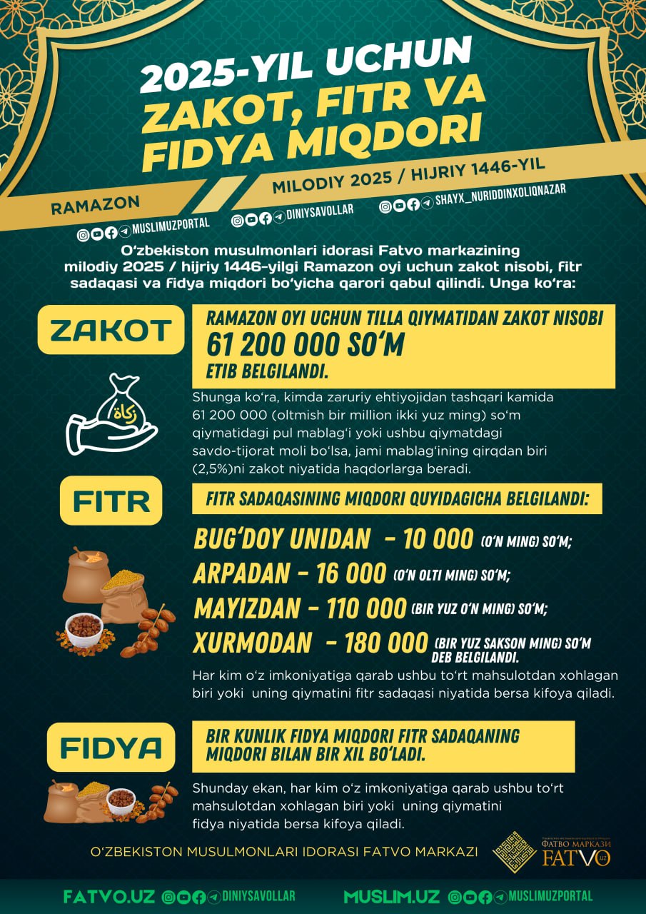 Ўзбекистон мусулмонлари идораси Фатво марказининг милодий 2025 / ҳижрий 1446 йилги Рамазон ойи учун закот нисоби, фитр садақаси ва фидя миқдори бўйича қарори қабул қилинди, унга кўра… – Ўзбекистон мусулмонлари идораси Фатво маркази