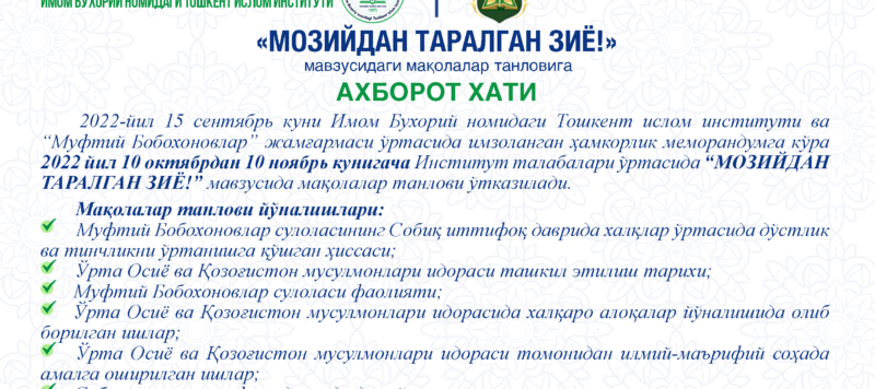 2022 йил 15 сентябрь куни Имом Бухорий номидаги Тошкент ислом институти ва “Муфтий Бобохоновлар” жамғармаси ўртасида имзоланган ҳамкорлик меморандумга кўра 2022 йил 10 октябрдан 10 ноябрь кунигача Институт талабалари ўртасида “Мозийдан таралган зиё!” мавзусида мақолалар танлови ўтказилади.Read More