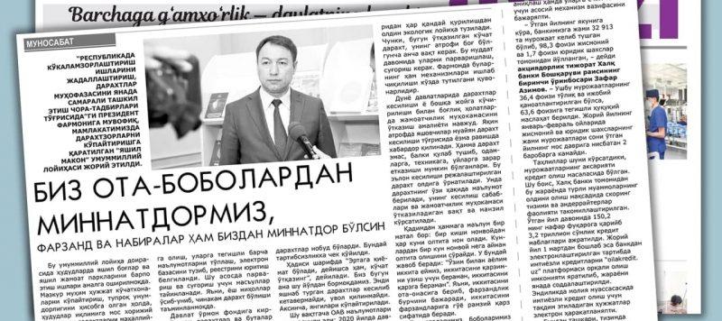“Республикада кўкаламзорлаштириш ишларини жадаллаштириш, дарахтлар муҳофазасини янада самарали ташкил этиш чора-тадбирлари тўғрисида”ги президент фармонига мувофиқ, мамлакатимизда дарахтзорларни кўпайтиришга қаратилган “яшил макон” умуммиллий лойиҳаси жорий этилди...- Имом Бухорий халқаро илмий-тадқиқот маркази директори Шовосил Зиёдов.Read More