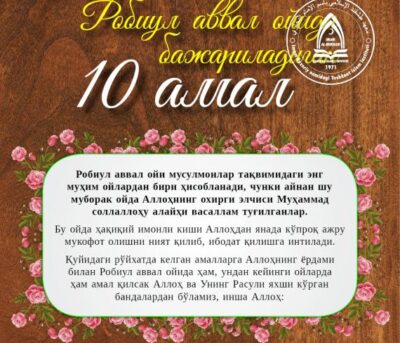 Робиул аввал ойи мусулмонлар тақвимидаги энг муҳим ойлардан бири ҳисобланади, чунки айнан шу муборак ойда Aллоҳнинг охирги элчиси Муҳаммад соллаллоҳу алайҳи васаллам туғилганлар.- Даврон НУРМУҲАММАДRead More