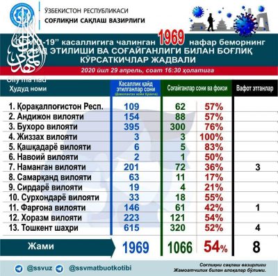 Жиззахда бемор йўқ, Қашқадарё, Бухоро, Қорақалпоғистон ва Андижонда соғайиш бўйича энг юқори кўрсаткичлар кузатилмоқда. Соғлиқни сақлаш вазирлиги матбуот котиби Фурқат Санаевнинг телеграм каналида беморлар қайд этилиши ва соғайиши бўйича кўрсаткичлар жадвали келтирилди.Read More