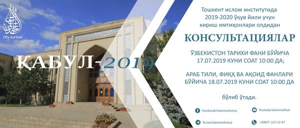 Тошкент ислом институтида 2019-2020 ўқув йили учун абитуриентлардан ҳужжатларни қабул қилиш бўйича қабул ҳайъати 2019 йил 15 июндан 15 июль кунига қадар фаолият олиб борди. Қабул жараёнларида 226 та абитуриентдан (шундан 184 нафари ўғил болалар, 42 нафари аёл-қизлар) аризалар қабул қилинди.Read More