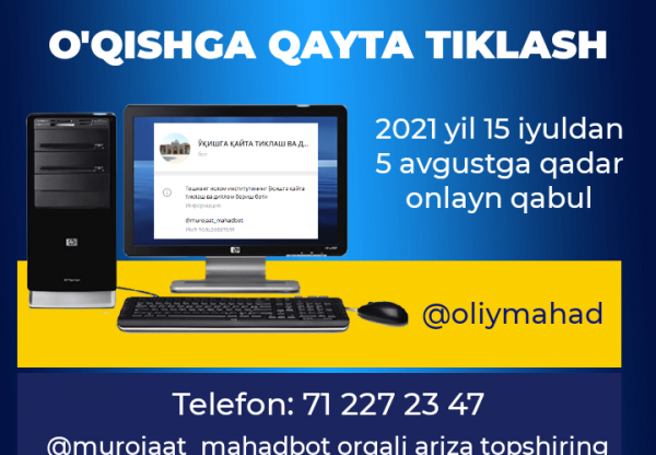 Ўзбекистон мусулмонлари идораси тасарруфидаги Тошкент ислом институтидан турли сабабларга кўра ўқишдан четлатилган ва узоқ йиллар олдин диний таълим муассасасини тамомлаб, диплом олмаган фуқароларни ўқишга қайта тиклаш бўйича 2021 йил 15 июлдан 5 августга қадар онлайн режимда @murojaat_mahadbot телеграм бот канали орқали аризалар қабули бошланганини эълон қилади.... - Ўқув-услубий бўлимRead More