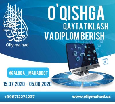Ўзбекистон мусулмонлари идораси тасарруфидаги Тошкент ислом институти қайта тиклаш ва зарур ҳолларда узоқ йиллар олдин диний таълим муассасасини тамомлаб, диплом олмаган шахсларга диплом бериш масалалари бўйича ишчи гуруҳ 2020 йил 15 июлдан 5 августга аризалар қабул қилишини эълон қилади.Read More