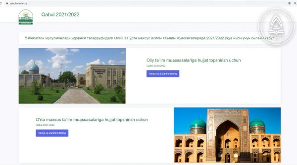 2021-2022 ўқув йили учун Тошкент ислом институтига абитуриентларнинг ҳужжатлари 20 июндан 20 июлгача онлайн шаклда qabul.muslim.uz сайти орқали қабул қилинади. Асосий ойнада олий таълим ва ўрта махсус таълим муассасаларига ҳужжат топширувчилар учун саҳифалар мавжуд. 1. Тошкент ислом институтига ҳужжат топширишда сайтнинг «Oliy ta’lim muassasalariga hujjat topshirish uchun» қисмидаги «Kiring va ariza to’ldiring» тугмаси босилади: 2. Олий таълим муассасалари саҳифасига кирилгач, «Asosiy ma’lumotlar» қисмидан «Тошкент ислом институти» олий ўқув юрти танланади:...Read More